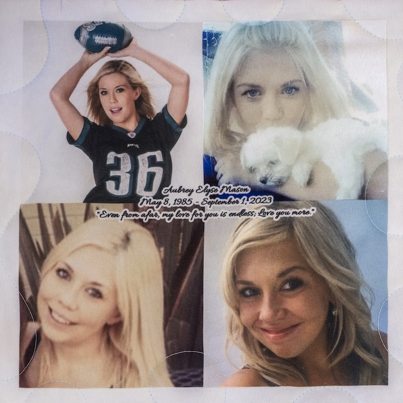 The quilt square has four pictures of Aubrey Elyse Mason, and in the center, her names, dates, and “I love you more,” which we always said to one another. Aubrey was a giver. She loved giving to people and surprised her family and friends because she always remembered what they said or did and saw their wants or needs without asking. She was a very thoughtful giver.