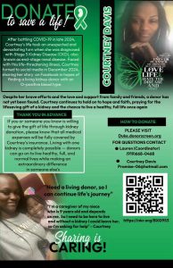 Having seen her aunt battle kidney disease later in life, Courtney is determined to find a kidney donor in hopes of avoiding dialysis. “I want to live a normal life without relying on a machine to survive,” she said. “I’m still young, full of life, and have so much more left to do on this earth.”